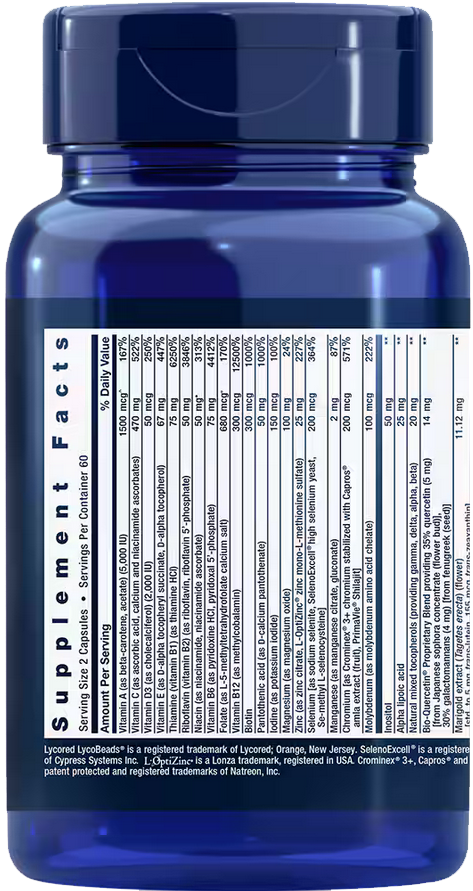 Витамин A (в форме бета-каротина, ацетата), Витамин C (в форме аскорбиновой кислоты, аскорбатов кальция и ниацинамида), Витамин D3 (в форме холекальциферола) (2000 МЕ), Витамин E (в форме D-альфа-токоферилсукцината, D-альфа-токоферола), Тиамин (витамин B1) (в форме тиамина гидрохлорида), Рибофлавин (витамин B2) (в форме рибофлавина, рибофлавина-5’-фосфата), Ниацин (в форме ниацинамида, аскорбата ниацинамида), Витамин B6 (в форме пиридоксина гидрохлорида, пиридоксаль 5’-фосфат), Фолат (в форме кальциевой соли L-5-метилтетрагидрофолата), Витамин B12 (в форме метилкобаламина), Биотин, Пантотеновая кислота (в форме пантотената D-кальция), Йод (в форме йодида калия), Магний (в форме оксида магния), Цинк (в форме цитрата цинка, моно-L-метионин сульфата цинка L-OptiZinc®), Селен (в форме селенита натрия, дрожжей SelenoExcell® с высоким содержанием селена, Se-метил-L-селеноцистеина), Марганец (в форме цитрата марганца, глюконата), Хром [в форме хрома Crominex® 3+, стабилизированного экстрактом амлы Capros® (плоды), мумиё PrimaVie®], Молибден (в форме аминокислотного хелата молибдена), Инозитол, Альфа-липоевая кислота, Натуральная смесь токоферолов (содержащая гамма-, дельта-, альфа- и бета-кислоты), Фирменная смесь Bio-Quercetin®, содержащая 35% кверцетина [из концентрата софоры японской (бутоны)], 30% галактоманнанов [из пажитника (семена)], Экстракт бархатцев прямостоячих (Tagetes erecta) (цветки), Апигенин, Бор (в форме аминокислотного хелата бора), Ликопин [из натурального экстракта томатов LycoBeads® (плодов)], микрокристаллическая целлюлоза, дикальцийфосфат, модифицированный пищевой крахмал, кроскармеллоза натрия, стеариновая кислота, мальтодекстрин, растительный стеарат, оболочка (очищенная вода, гипромеллоза, глицерин), диоксид кремния, подсолнечный лецитин, подсолнечное масло