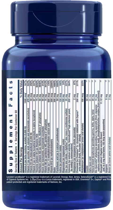 Витамин A (в форме бета-каротина, ацетата), Витамин C (в форме аскорбиновой кислоты, аскорбатов кальция и ниацинамида), Витамин D3 (в форме холекальциферола) (2000 МЕ), Витамин E (в форме D-альфа-токоферилсукцината, D-альфа-токоферола), Тиамин (витамин B1) (в форме тиамина гидрохлорида), Рибофлавин (витамин B2) (в форме рибофлавина, рибофлавина-5’-фосфата), Ниацин (в форме ниацинамида, аскорбата ниацинамида), Витамин B6 (в форме пиридоксина гидрохлорида, пиридоксаль 5’-фосфат), Фолат (в форме кальциевой соли L-5-метилтетрагидрофолата), Витамин B12 (в форме метилкобаламина), Биотин, Пантотеновая кислота (в форме пантотената D-кальция), Йод (в форме йодида калия), Магний (в форме оксида магния), Цинк (в форме цитрата цинка, моно-L-метионин сульфата цинка L-OptiZinc®), Селен (в форме селенита натрия, дрожжей SelenoExcell® с высоким содержанием селена, Se-метил-L-селеноцистеина), Марганец (в форме цитрата марганца, глюконата), Хром [в форме хрома Crominex® 3+, стабилизированного экстрактом амлы Capros® (плоды), мумиё PrimaVie®], Молибден (в форме аминокислотного хелата молибдена), Инозитол, Альфа-липоевая кислота, Натуральная смесь токоферолов (содержащая гамма-, дельта-, альфа- и бета-кислоты), Фирменная смесь Bio-Quercetin®, содержащая 35% кверцетина [из концентрата софоры японской (бутоны)], 30% галактоманнанов [из пажитника (семена)], Экстракт бархатцев прямостоячих (Tagetes erecta) (цветки), Апигенин, Бор (в форме аминокислотного хелата бора), Ликопин [из натурального экстракта томатов LycoBeads® (плодов)], микрокристаллическая целлюлоза, дикальцийфосфат, модифицированный пищевой крахмал, кроскармеллоза натрия, стеариновая кислота, мальтодекстрин, растительный стеарат, оболочка (очищенная вода, гипромеллоза, глицерин), диоксид кремния, подсолнечный лецитин, подсолнечное масло