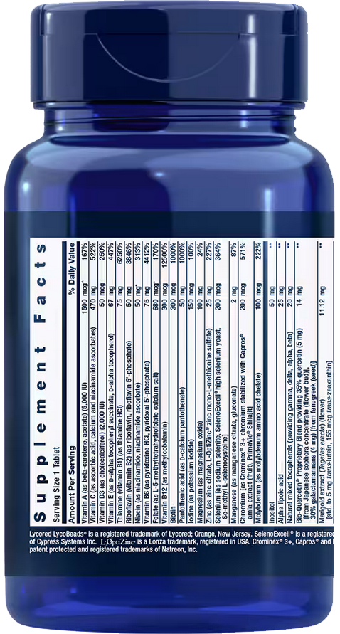 Витамин A (в форме бета-каротина, ацетата), Витамин C (в форме аскорбиновой кислоты, аскорбатов кальция и ниацинамида), Витамин D3 (в форме холекальциферола) (2000 МЕ), Витамин E (в форме D-альфа-токоферилсукцината, D-альфа-токоферола), Тиамин (витамин B1) (в форме тиамина гидрохлорида), Рибофлавин (витамин B2) (в форме рибофлавина, рибофлавина-5’-фосфата), Ниацин (в форме ниацинамида, аскорбата ниацинамида), Витамин B6 (в форме пиридоксина гидрохлорида, пиридоксаль 5’-фосфат), Фолат (в форме кальциевой соли L-5-метилтетрагидрофолата), Витамин B12 (в форме метилкобаламина), Биотин, Пантотеновая кислота (в форме пантотената D-кальция), Йод (в форме йодида калия), Магний (в форме оксида магния), Цинк (в форме цитрата цинка, моно-L-метионин сульфата цинка L-OptiZinc®), Селен (в форме селенита натрия, дрожжей SelenoExcell® с высоким содержанием селена, Se-метил-L-селеноцистеина), Марганец (в форме цитрата марганца, глюконата), Хром [в форме хрома Crominex® 3+, стабилизированного экстрактом амлы Capros® (плоды), мумиё PrimaVie®], Молибден (в форме аминокислотного хелата молибдена), Инозитол, Альфа-липоевая кислота, Натуральная смесь токоферолов (содержащая гамма-, дельта-, альфа- и бета-кислоты), Фирменная смесь Bio-Quercetin®, содержащая 35% кверцетина [из концентрата софоры японской (бутоны)], 30% галактоманнанов [из пажитника (семена)], Экстракт бархатцев прямостоячих (Tagetes erecta) (цветки), Апигенин, Бор (в форме аминокислотного хелата бора), Ликопин [из натурального экстракта томатов LycoBeads® (плодов)], микрокристаллическая целлюлоза, дикальцийфосфат, модифицированный пищевой крахмал, кроскармеллоза натрия, стеариновая кислота, мальтодекстрин, растительный стеарат, оболочка (очищенная вода, гипромеллоза, глицерин), диоксид кремния, подсолнечный лецитин, подсолнечное масло