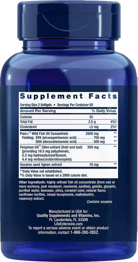 Эйкозапентаеновая кислота, докозагексаеновая кислота, Экстракт оливы Polyphen-OilTM, Экстракт лигнанов семян кунжута, высокоочищенный концентрат рыбьего жира (из одного или нескольких видов анчоуса, ставриды, скумбрии, сардины), желатин, глицерин, очищенная вода, пчелиный воск, диоксид кремния, карамельный краситель, натуральный ароматизатор, подсолнечный лецитин, смесь токоферолов, экстракт розмарина