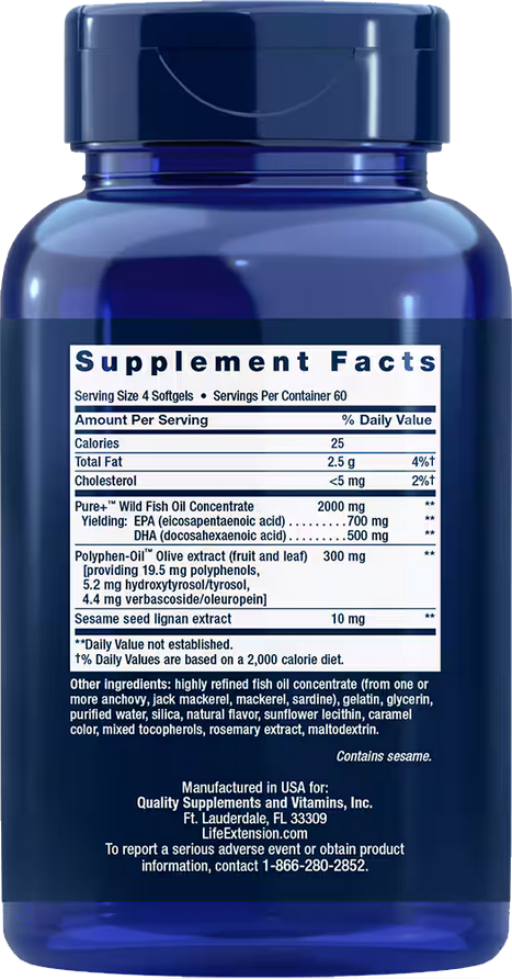 Эйкозапентаеновая кислота, докозагексаеновая кислота, Экстракт оливы Polyphen-OilTM, Экстракт лигнанов семян кунжута, высокоочищенный концентрат рыбьего жира (из одного или нескольких видов анчоуса, ставриды, скумбрии, сардины), желатин, глицерин, очищенная вода, пчелиный воск, диоксид кремния, карамельный краситель, натуральный ароматизатор, подсолнечный лецитин, смесь токоферолов, экстракт розмарина