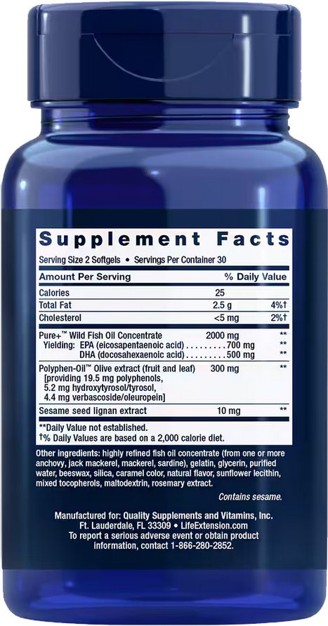Эйкозапентаеновая кислота, докозагексаеновая кислота, Экстракт оливы Polyphen-OilTM, Экстракт лигнанов семян кунжута, высокоочищенный концентрат рыбьего жира (из одного или нескольких видов анчоуса, ставриды, скумбрии, сардины), желатин, глицерин, очищенная вода, пчелиный воск, диоксид кремния, карамельный краситель, натуральный ароматизатор, подсолнечный лецитин, смесь токоферолов, экстракт розмарина