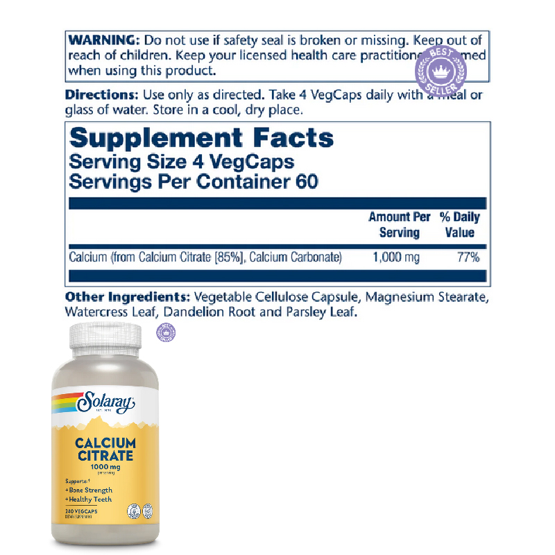 Цитрат кальция от Solaray — пищевая добавка для укрепления костей и костной ткани, обеспечения здоровой работы мышц и сердечно-сосудистой системы. Кальций необходим для формирования костей, хрящевой ткани, зубов, а также волос, ногтей, зубной эмали. Он необходим для укрепления позвоночника, предупреждения переломов и травм костей. Продукт содержит кальций в форме цитрата, который усваивается вне зависимости от приема пищи и кислотности желудочного сока. AL Calcium Citrate — представляет собой строительный материал, который помогает сохранить кости и зубы сильными и здоровыми. Он поддерживает здоровье опорно-двигательного аппарата и нервной системы, а также участвует в регуляции сердечных ритмов. Данный препарат содержит кальций в легко усваиваемой цитратной форме. Описание В медицине цитрат кальция используется в медикаментах, предназначенных для нормализации уровня кальция в организме. Также цитрат кальция применяют при остеопорозе, рахите, гипопаратиреозе и скрытой тетании. Кальций — обязателен для строительства и поддержания здоровья костей и костной ткани. Магний — контролирует абсорбцию кальция, равномерность роста, гибкость и прочность костной ткани. Если в клетках мало магния, то его место занимает кальций. Витамин К — регулирует активность главного белка кости — остеокальцина. Недостаток кальция в организме обусловлен следующей симптоматикой: ухудшается состояние волос и ногтей; начинают крошиться зубы, их чувствительность повышается, учащаются случаи кариеса; появляется общая слабость, усталость, снижение работоспособности. Представляет собой органическую соль, которая образуется при взаимодействии карбоната кальция с лимонной кислотой. Получаемый продукт хорошо растворяется в воде, поэтому хорошо усваивается организмом и практически не вымывается из костей, в отличие от других форм кальция. Регулярное применение цитрата кальция позволяет снизить уровень апатии и раздражительности, а также защитить свой организм от заболеваний опорно-двигательного аппарата: остеопороз, рахит у детей, размягчение костей.Его можно использовать для лечения состояний, вызванных низким уровнем кальция, таких как потеря костной массы (остеопороз), слабость костей (остеомаляция/рахит), снижение активности паращитовидной железы (гипопаратиреоз) и определенные мышечные заболевания (латентная тетания