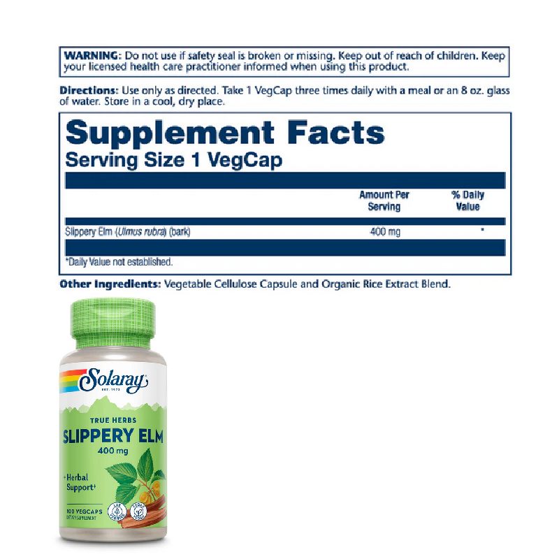 Solaray Slippery Elm Bark — натуральная добавка на основе коры красного вяза, традиционно применяемой для поддержки здоровья желудочно-кишечного тракта и облегчения раздражения слизистых оболочек.