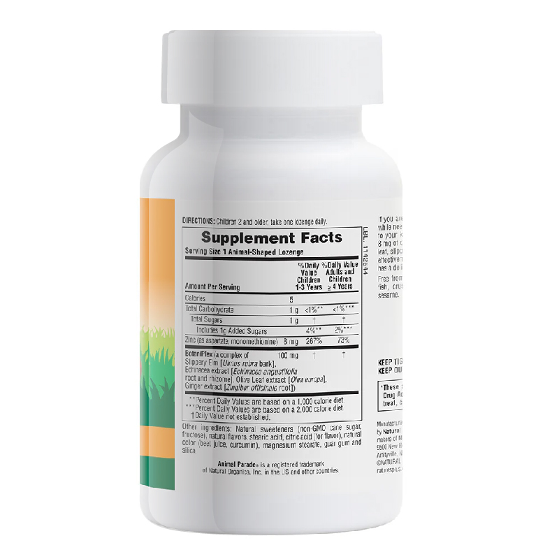 Пастилки Animal Parade Kid Zinc имеют точно выверенный состав, в котором сочетаются две формы органического цинка в хелатной форме и активные растительные компоненты. Каждая пастилка быстрого действия содержит 8 мг органического цинка в хелатной форме высочайшего качества: элементарный цинк из аспартата цинка и монометионин цинка. Пастилки Kid Zinc также содержат успокаивающую комбинацию травяных экстрактов, в том числе эхинацеи, оливкового листа, красного вяза и имбиря, которые веками используются практикующими врачами.